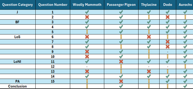 Summary table of de-extinction candidate species suitability using green ticks (yes), red crosses (no), yellow exclamation marks (uncertain), and black dashes (unknown) to represent answers to questions 1-15 (Categories: Justification (J), Biological Feasibility (BF), Likelihood of Success (LoS), Likelihood of Negative Impacts (LoNI) and Public Acceptance (PA)) and conclusion.